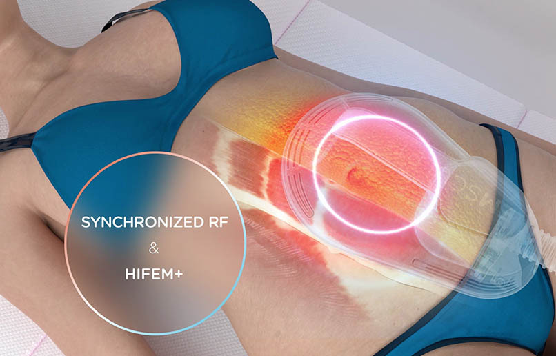 It is based on an applicator simultaneously emitting synchronized RF and HIFEM+ energies.