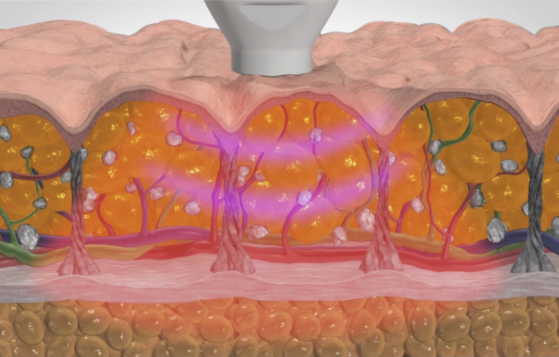 It results in diminishing of fat chambers, remodelling of collagen fibers, restoring skin elasticity, increase in blood flow and metabolic waste removal.
